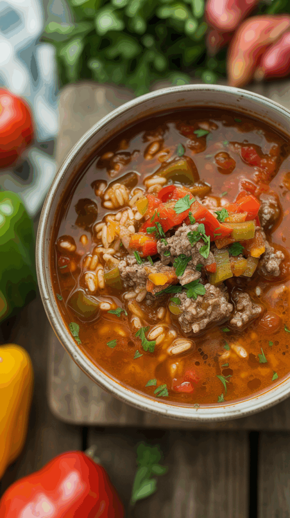 Stuffed peppers (dolma-style dishes) date back to the Ottoman Empire, but the American “stuffed pepper” version became popular in the 20th century. The soup variation likely came from home cooks in the Midwest looking for a faster, one-pot version. It’s now a cold-weather staple — classic comfort, simplified.