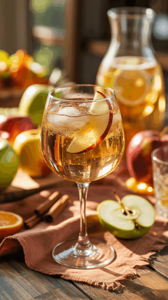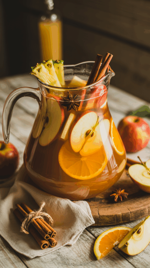 The flavor is crisp, lightly sweet, and beautifully aromatic with floating fruit slices that make it visually stunning on the table. It tastes like a toast to fall — bright, golden, and festive.